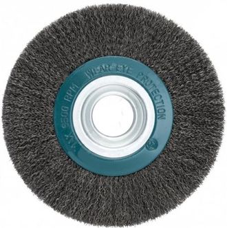 Дисковая щетка Профоснастка Мастер 100 мм с гофрированной стальной проволокой для использования на точило (заточных станках). Диаметр щекти 100 мм, посадочный диаметр 20 мм. Максимальное количество оборотов – 6000 об/мин. Проволока стальная гофрированная 0,3 мм (тип ST). Рабочая высота 19 мм, длина проволоки 17 мм.
