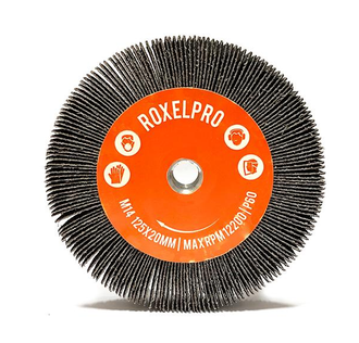 Лепестковая абразивная щетка RoxelPro ROXTOP с креплением М14 125x20мм используется для обработки стали и нержавеющей стали (INOX), пластмассы. Крепление М14 подходит для всех УШМ.