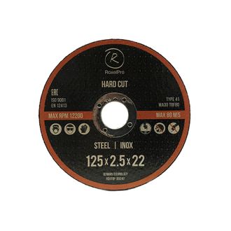 Отрезной круг RoxelPro ROXTOP HARD CUT 125 x 1.6 x 22мм, Т41 по нержавеющей стали, металлу. Подходит для резки стальных листов, профилей, труб, прутьев и сплошного металла.